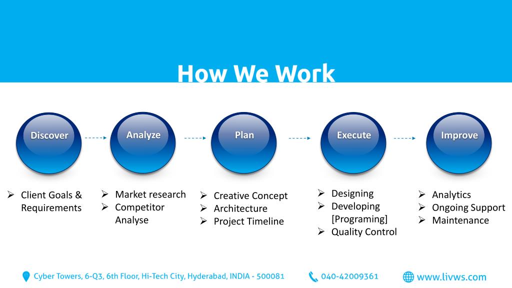 Designing • Developing [Programing] • Quality Control • Market research • Competitor Analyse • Analytics • Ongoing Support • Maintenance • Client Goals & Requirements • Creative Concept • Architecture • Project Timeline Discover Analyze Plan Execute Improve