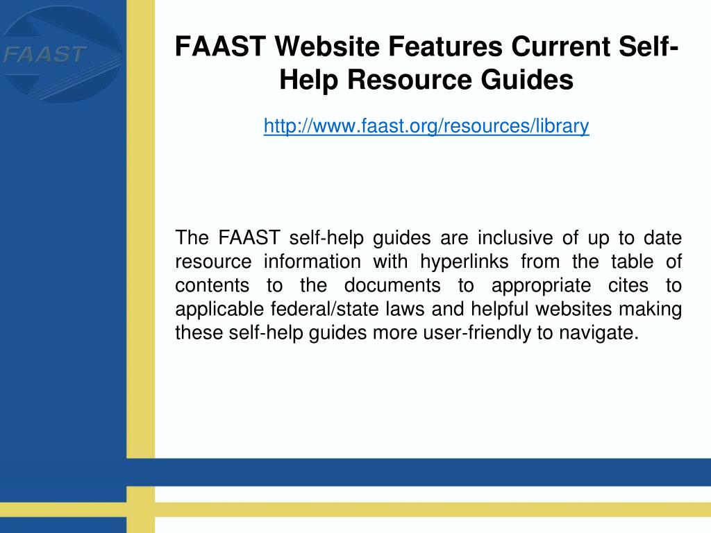 FAAST Website Features Current Self-Help Resource Guideshttp://www.faast.org/resources/library The FAAST self‐help guides are inclusive of up to date resource information with hyperlinks from the table of contents to the documents to appropriate cites to applicable federal/state laws and helpful websites making these self‐help guides more user‐friendly to navigate.