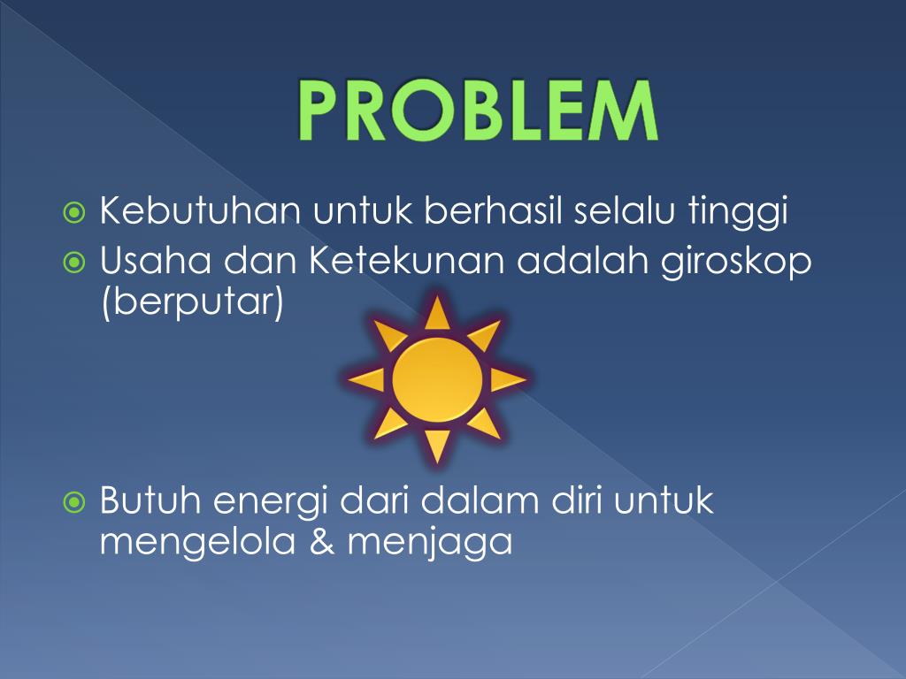 PROBLEM • Kebutuhan untuk berhasil selalu tinggi • Usaha dan Ketekunan adalah giroskop (berputar) • Butuh energi dari dalam diri untuk mengelola & menjaga