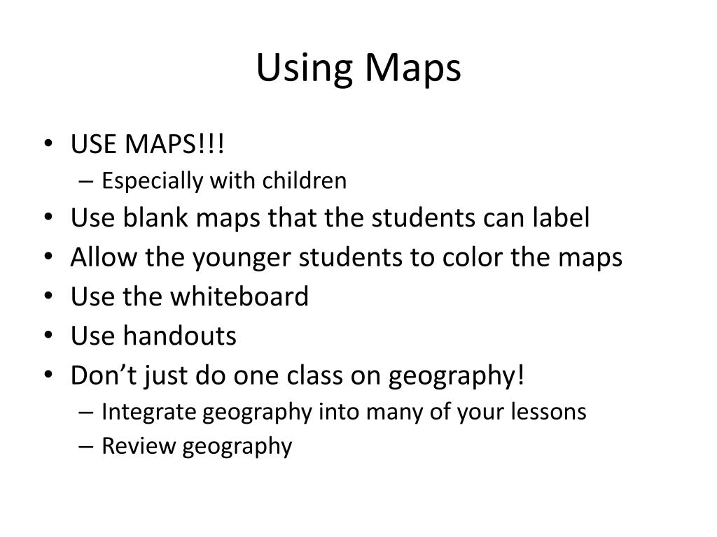 Using Maps • USE MAPS!!! • Especially with children • Use blank maps that the students can label • Allow the younger students to color the maps • Use the whiteboard • Use handouts • Don’t just do one class on geography! • Integrate geography into many of your lessons • Review geography