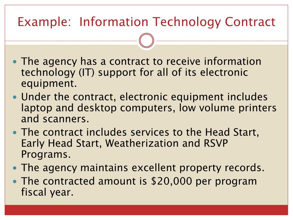 Example: Information Technology Contract The agency has a contract to receive information technology (IT) support for all of its electronic equipment. Under the contract, electronic equipment includes laptop and desktop computers, low volume printers and scanners. The contract includes services to the Head Start, Early Head Start, Weatherization and RSVP Programs. The agency maintains excellent property records. The contracted amount is $20,000 per program fiscal year.