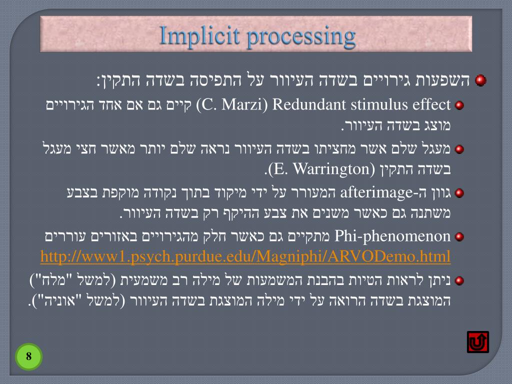 Implicit processing • השפעות גירויים בשדה העיוור על התפיסה בשדה התקין: • Redundant stimulus effect(C. Marzi) קיים גם אם אחד הגירויים מוצג בשדה העיוור. • מעגל שלם אשר מחציתו בשדה העיוור נראה שלם יותר מאשר חצי מעגל בשדה התקין (E. Warrington). • גוון ה-afterimage המעורר על ידי מיקוד בתוך נקודה מוקפת בצבע משתנה גם כאשר משנים את צבע ההיקף רק בשדה העיוור. • Phi-phenomenon מתקיים גם כאשר חלק מהגירויים באזורים עוררים http://www1.psych.purdue.edu/Magniphi/ARVODemo.html • ניתן לראות הטיות בהבנת המשמעות של מילה רב משמעית (למשל "מלח") המוצגת בשדה הרואה על ידי מילה המוצגת בשדה העיוור (למשל "אוניה").