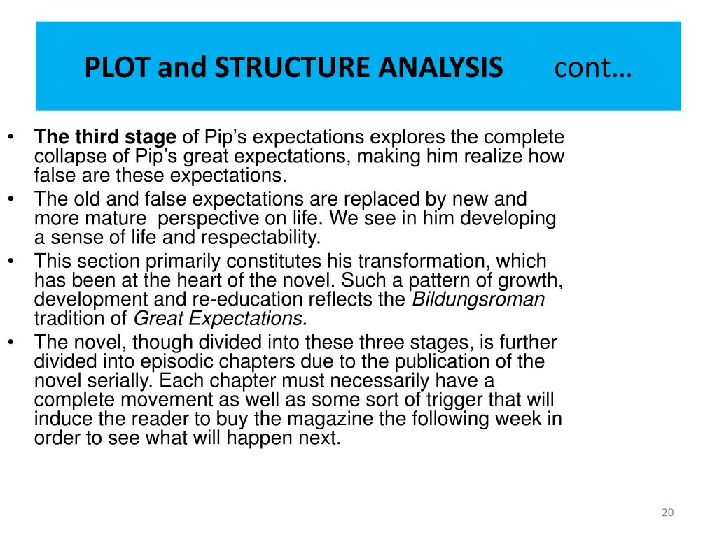 PLOT and STRUCTURE ANALYSIS cont… • The third stage of Pip’s expectations explores the complete collapse of Pip’s great expectations, making him realize how false are these expectations. • The old and false expectations are replaced by new and more mature perspective on life. We see in him developing a sense of life and respectability. • This section primarily constitutes his transformation, which has been at the heart of the novel. Such a pattern of growth, development and re-education reflects the Bildungsromantradition of Great Expectations. • The novel, though divided into these three stages, is further divided into episodic chapters due to the publication of the novel serially. Each chapter must necessarily have a complete movement as well as some sort of trigger that will induce the reader to buy the magazine the following week in order to see what will happen next.