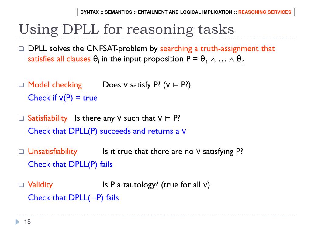 Using DPLL for reasoning tasks SYNTAX :: SEMANTICS :: ENTAILMENT AND LOGICAL IMPLICATION :: REASONING SERVICES • DPLL solves the CNFSAT-problem by searching a truth-assignment that satisfies all clausesθi in the input proposition P = θ1 … θn • Model checking Does ν satisfy P? (ν⊨ P?) Check if ν(P) = true • Satisfiability Is there any ν such that ν⊨ P? Check that DPLL(P) succeeds and returns a ν • Unsatisfiability Is it true that there are no ν satisfying P? Check that DPLL(P) fails • Validity Is P a tautology? (true for all ν) Check that DPLL(P) fails 18