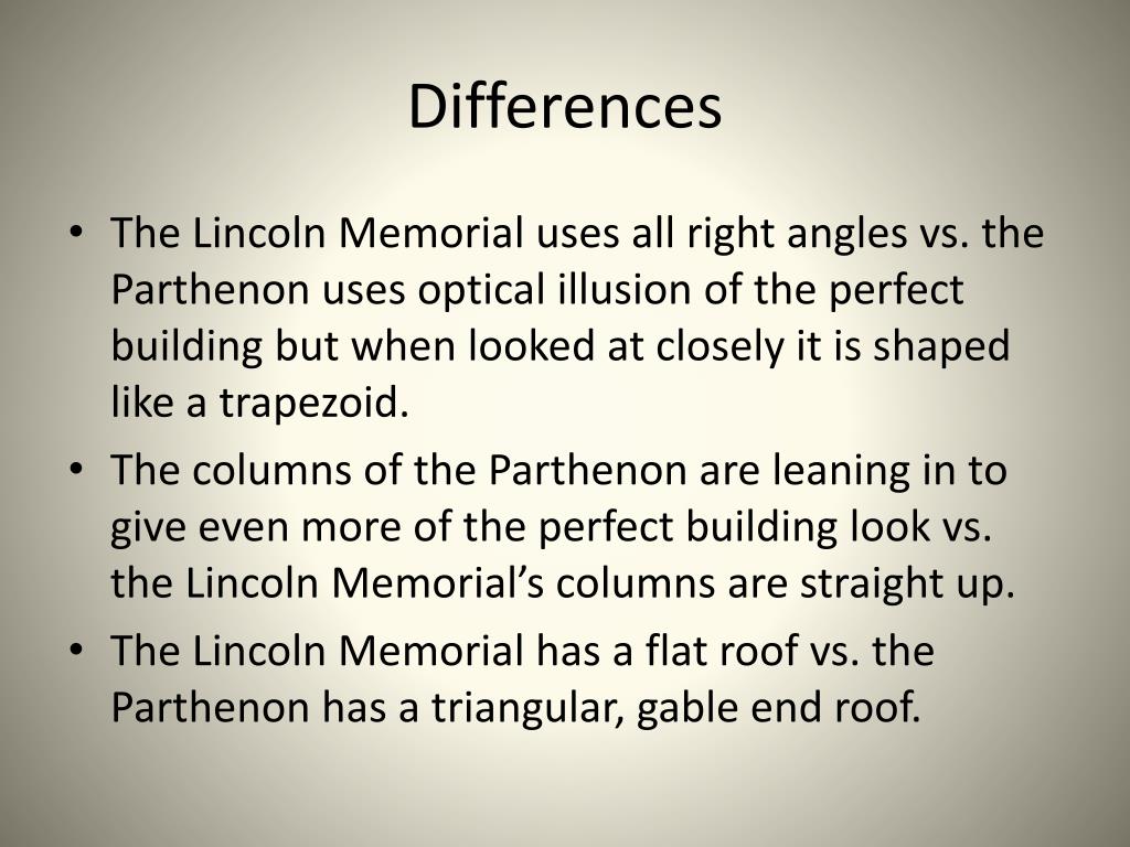 Differences • The Lincoln Memorial uses all right angles vs. the Parthenon uses optical illusion of the perfect building but when looked at closely it is shaped like a trapezoid. • The columns of the Parthenon are leaning in to give even more of the perfect building look vs. the Lincoln Memorial’s columns are straight up. • The Lincoln Memorial has a flat roof vs. the Parthenon has a triangular, gable end roof.
