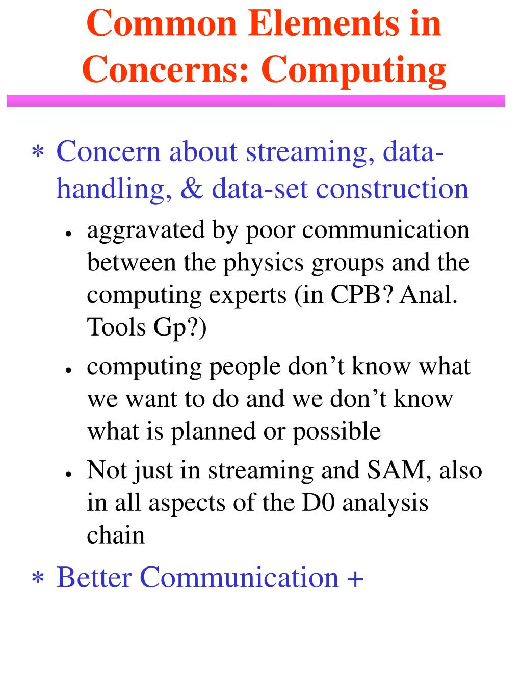 Common Elements in Concerns: Computing • Concern about streaming, data-handling, & data-set construction • aggravated by poor communication between the physics groups and the computing experts (in CPB? Anal. Tools Gp?) • computing people don’t know what we want to do and we don’t know what is planned or possible • Not just in streaming and SAM, also in all aspects of the D0 analysis chain • Better Communication +
