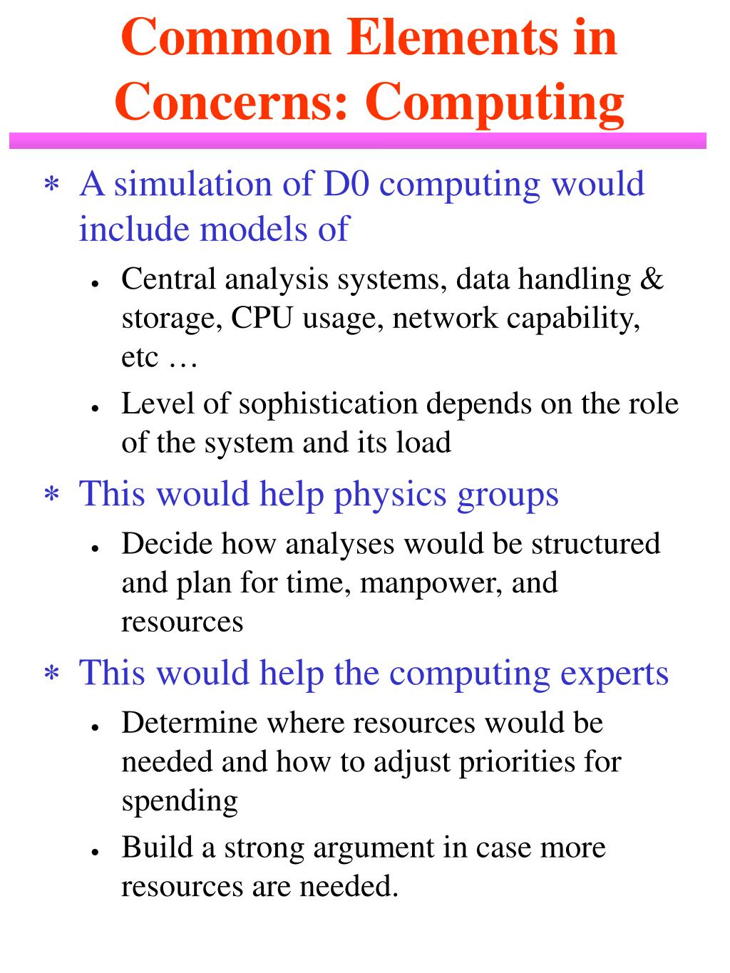 Common Elements in Concerns: Computing • A simulation of D0 computing would include models of • Central analysis systems, data handling & storage, CPU usage, network capability, etc … • Level of sophistication depends on the role of the system and its load • This would help physics groups • Decide how analyses would be structured and plan for time, manpower, and resources • This would help the computing experts • Determine where resources would be needed and how to adjust priorities for spending • Build a strong argument in case more resources are needed.