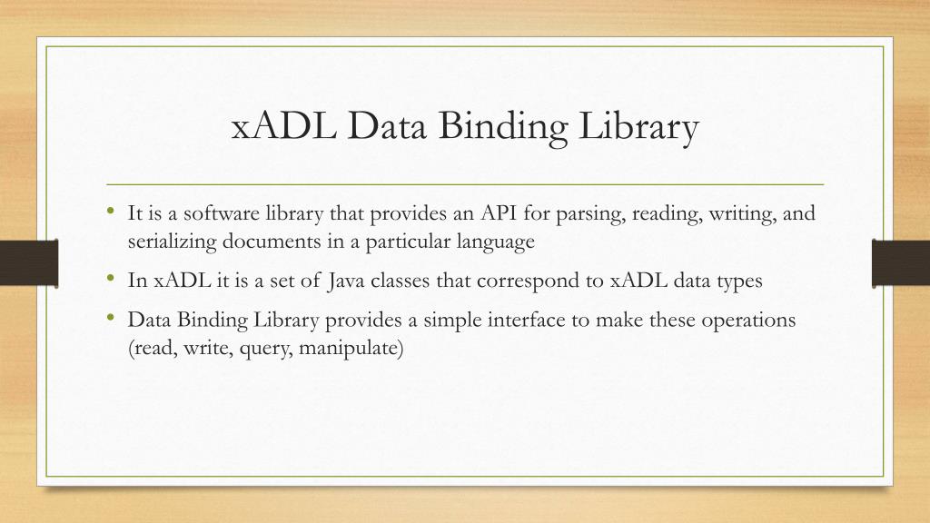 xADL Data Binding Library • It is a software library that provides an API for parsing, reading, writing, and serializing documents in a particular language • In xADL it is a set of Java classes that correspond to xADL data types • Data Binding Library provides a simple interface to make these operations (read, write, query, manipulate)