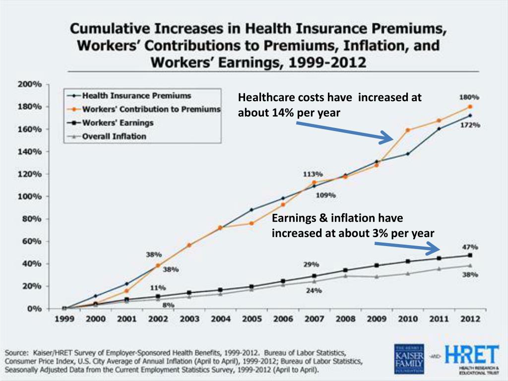 Healthcare costs have increased at about 14% per year Earnings & inflation have increased at about 3% per year