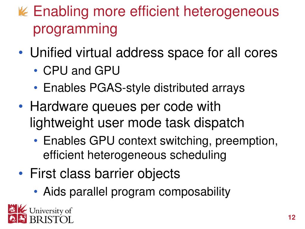 Enabling more efficient heterogeneous programming • Unified virtual address space for all cores • CPU and GPU • Enables PGAS-style distributed arrays • Hardware queues per code with lightweight user mode task dispatch • Enables GPU context switching, preemption, efficient heterogeneous scheduling • First class barrier objects • Aids parallel program composability