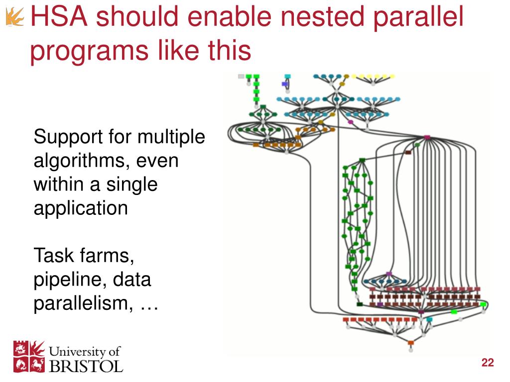 HSA should enable nested parallel programs like this • Support for multiple algorithms, even within a single application • Task farms, pipeline, data parallelism, …