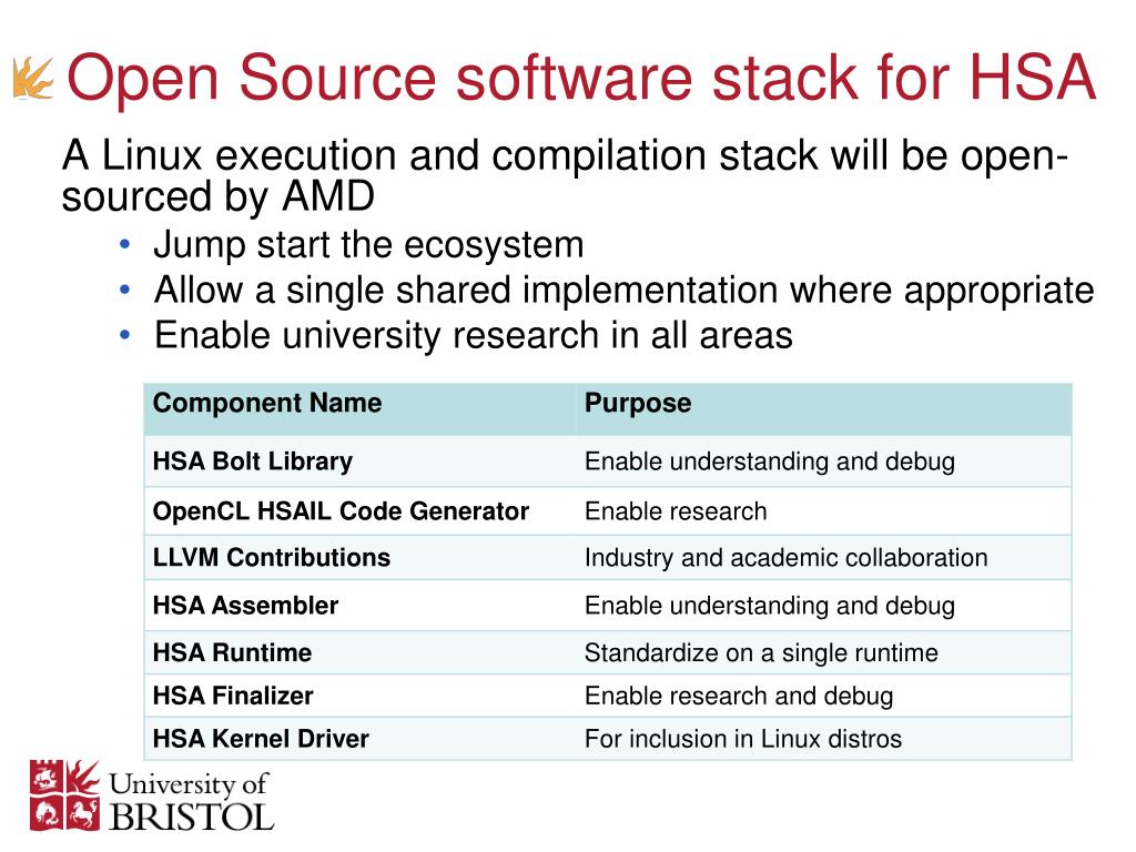 Open Source software stack for HSA A Linux execution and compilation stack will be open-sourced by AMD • Jump start the ecosystem • Allow a single shared implementation where appropriate • Enable university research in all areas