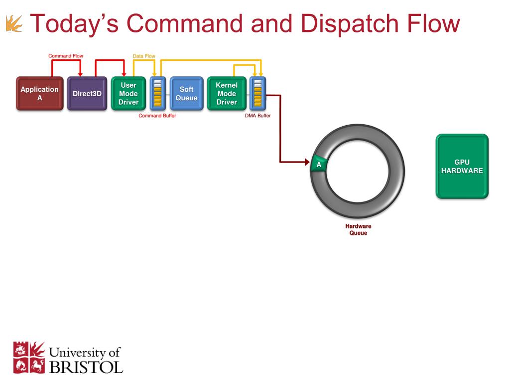 Today’s Command and Dispatch Flow Command Flow Data Flow Application A Direct3D User Mode Driver Soft Queue Kernel Mode Driver GPU HARDWARE A Hardware Queue Command Buffer DMA Buffer