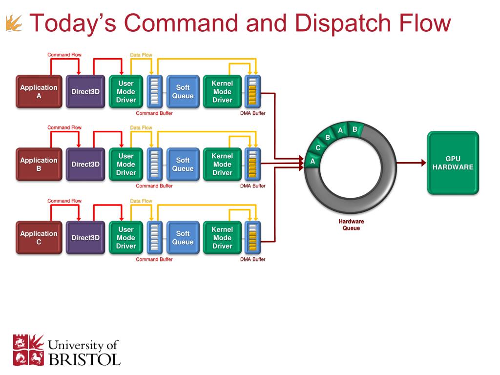 Today’s Command and Dispatch Flow Command Flow Data Flow Application A Direct3D User Mode Driver Soft Queue Kernel Mode Driver Command Flow Data Flow B A B GPU HARDWARE Application B Direct3D User Mode Driver Soft Queue Kernel Mode Driver C A Command Flow Data Flow Application C Direct3D User Mode Driver Soft Queue Kernel Mode Driver Hardware Queue Command Buffer Command Buffer Command Buffer DMA Buffer DMA Buffer DMA Buffer