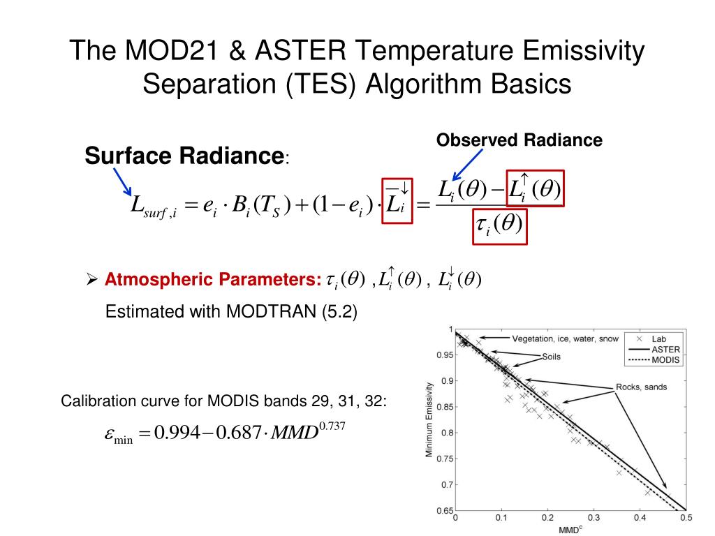 The MOD21 & ASTER Temperature Emissivity Separation (TES) Algorithm Basics Observed Radiance Surface Radiance: • Atmospheric Parameters: , , • Estimated with MODTRAN (5.2) Calibration curve for MODIS bands 29, 31, 32:
