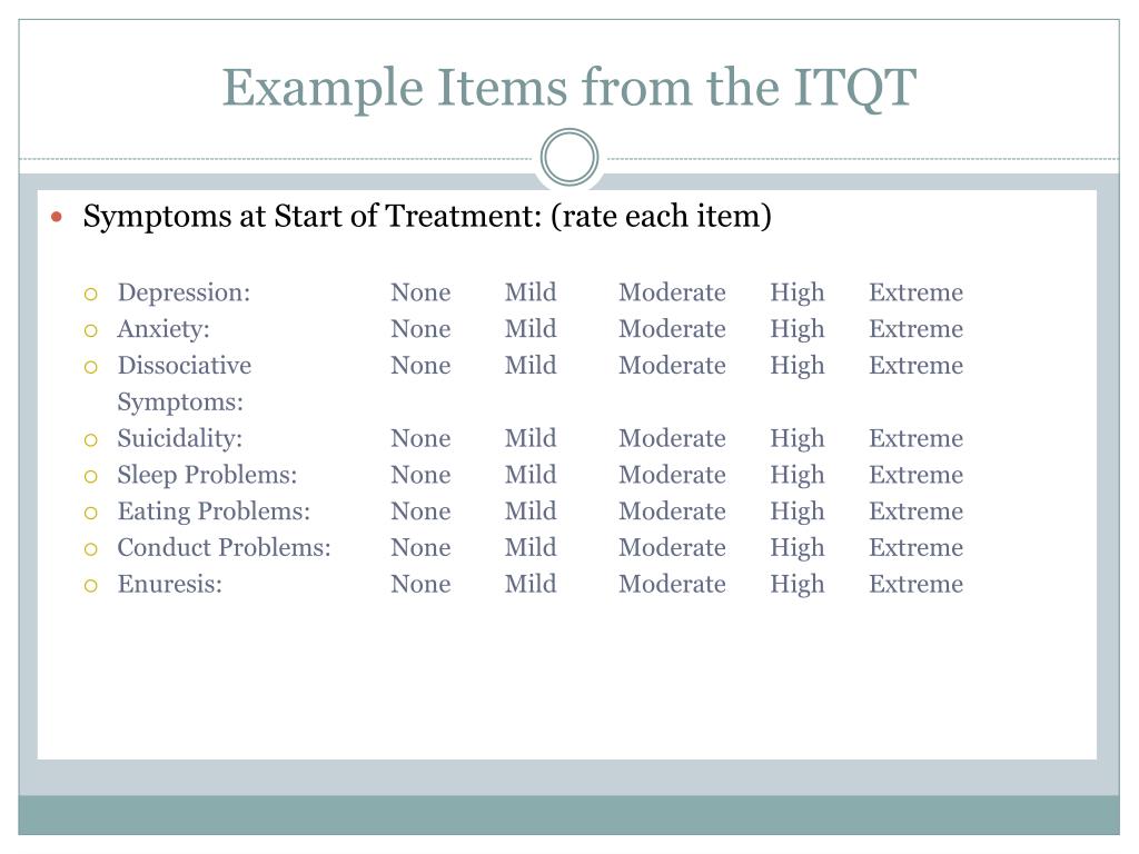 Example Items from the ITQT • Symptoms at Start of Treatment: (rate each item) • Depression: None Mild Moderate High Extreme • Anxiety: None Mild Moderate High Extreme • Dissociative None Mild Moderate High Extreme Symptoms: • Suicidality: None Mild Moderate High Extreme • Sleep Problems: None Mild Moderate High Extreme • Eating Problems: None Mild Moderate High Extreme • Conduct Problems: None Mild Moderate High Extreme • Enuresis: None Mild Moderate High Extreme