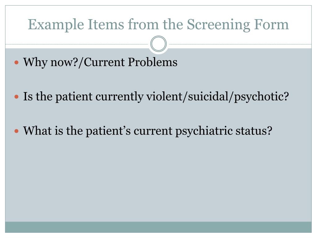 Example Items from the Screening Form Why now?/Current Problems Is the patient currently violent/suicidal/psychotic? What is the patient’s current psychiatric status?