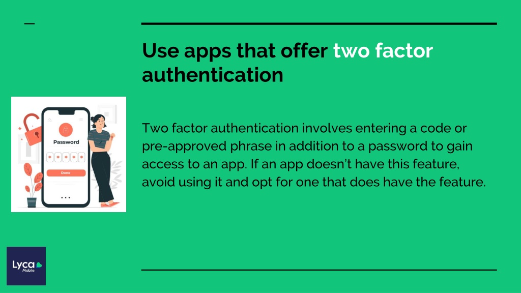 Use apps that offer two factor authentication Two factor authentication involves entering a code or pre-approved phrase in addition to a password to gain access to an app. If an app doesn’t have this feature, avoid using it and opt for one that does have the feature.