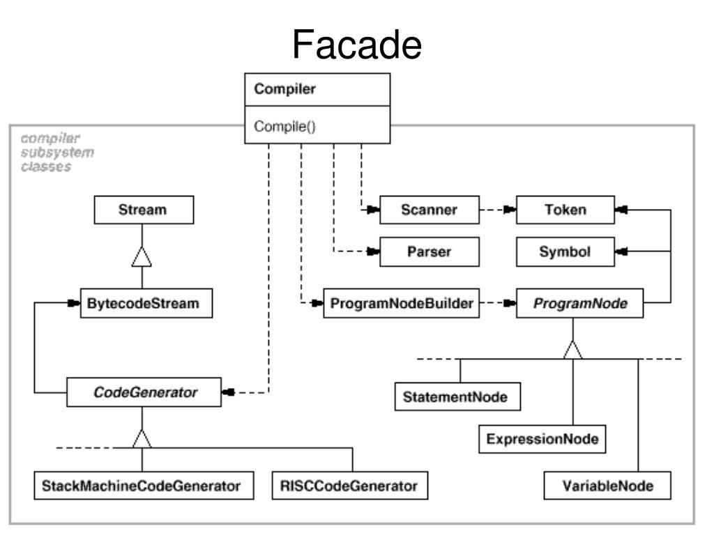 Adapter • Context / problemHow to resolve incompatible interfaces, or provide a stable interface to similar components with different interfaces? • Solution:Convert the original interface of a component into another interface, through an intermediate adapter object.