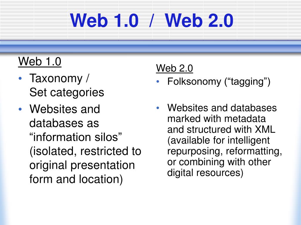 Web 1.0 Taxonomy / Set categories Websites and databases as “information silos” (isolated, restricted to original presentation form and location) Web 2.0 Folksonomy (“tagging”) Websites and databases marked with metadata and structured with XML (available for intelligent repurposing, reformatting, or combining with other digital resources) Web 1.0 / Web 2.0