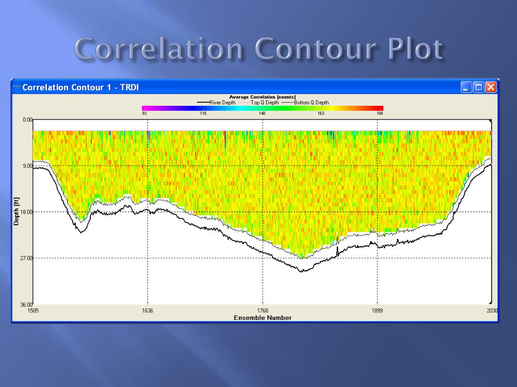 Error Velocity Contour • Error velocities should be randomly distributed • areas of high area error velocities may occur when water is not flowing at similar magnitudes and direction in all beams (example: turbulence) • Error velocities may also be the result of an instrument measuring one beam velocity wrong Behind Bridge Pier
