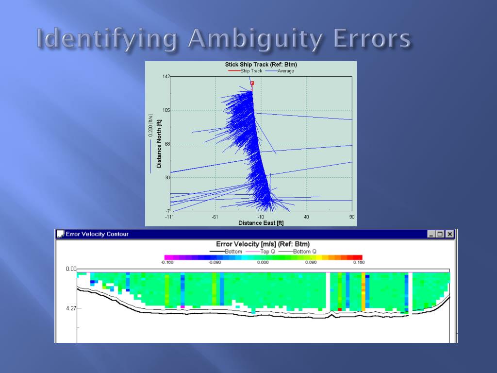 What Does This Mean? Lag = Time between pulses in a ping Long lag = accurate measurements Long lag = low ambiguity velocity Exceed ambiguity velocity = ambiguity error Ambiguity error = inaccurate measurements Lag needs to be optimized based on maximum speed SonTek usually has short lags (no chance for ambiguity errors but noisy – pictures close together and wheel hasn’t turned much in lower velocites) TRDI – usually has longer lags that need to be adjusted for conditions (less noise, but chance for ambiguity errors if not adjusted correctly)