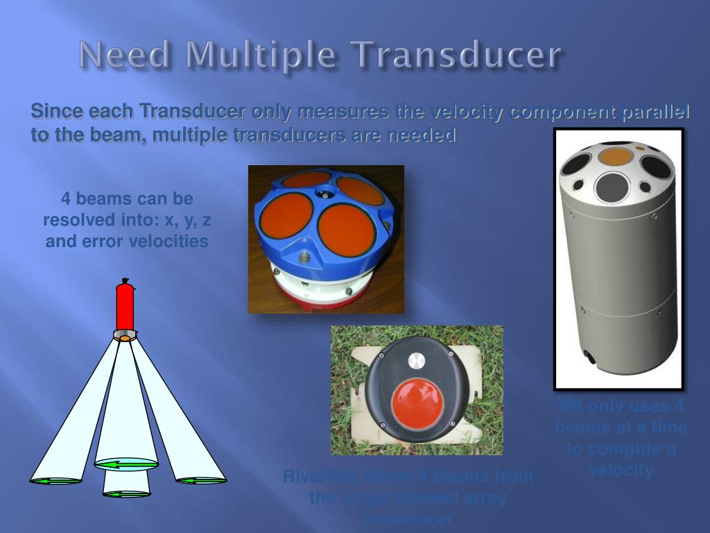 Need Multiple Transducer Since each Transducer only measures the velocity component parallelto the beam, multiple transducers are needed 4 beams can be resolved into: x, y, z and error velocities M9 only uses 4 beams at a time to compute a velocity RiverRay forms 4 beams from the single phased array transducer