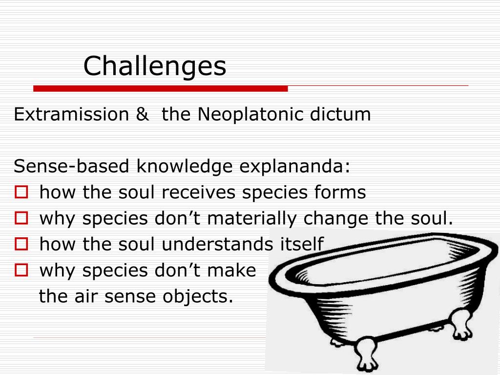 Challenges Extramission & the Neoplatonic dictum Sense-based knowledge explananda: • how the soul receives species forms • why species don’t materially change the soul. • how the soul understands itself • why species don’t make the air sense objects.