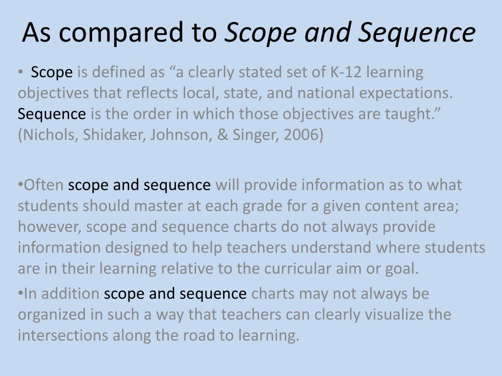 As compared to Scope and Sequence Scope is defined as “a clearly stated set of K-12 learning objectives that reflects local, state, and national expectations. Sequence is the order in which those objectives are taught.” (Nichols, Shidaker, Johnson, & Singer, 2006) Often scope and sequence will provide information as to what students should master at each grade for a given content area; however, scope and sequence charts do not always provide information designed to help teachers understand where students are in their learning relative to the curricular aim or goal. In addition scope and sequence charts may not always be organized in such a way that teachers can clearly visualize the intersections along the road to learning.