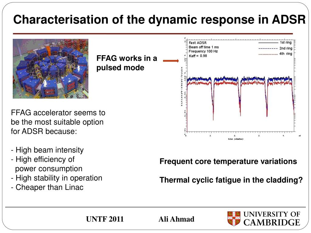 Characterisation of the dynamic response in ADSR FFAG works in a pulsed mode Agenda FFAG accelerator seems to be the most suitable option for ADSR because: - High beam intensity - High efficiency of power consumption - High stability in operation - Cheaper than Linac Frequent core temperature variations Thermal cyclic fatigue in the cladding? UNTF 2011 Ali Ahmad