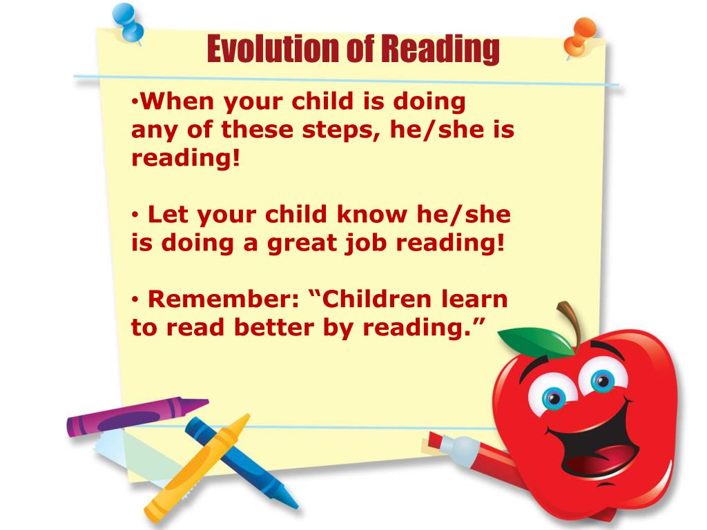 Evolution of Reading • When your child is doing any of these steps, he/she is reading! • Let your child know he/she is doing a great job reading! • Remember: “Children learn to read better by reading.”