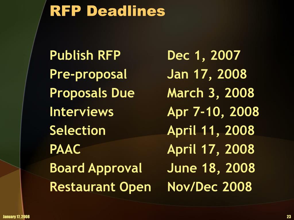 RFP Deadlines Publish RFP Dec 1, 2007 Pre-proposal Jan 17, 2008 Proposals Due March 3, 2008 Interviews Apr 7-10, 2008 Selection April 11, 2008 PAAC April 17, 2008 Board Approval June 18, 2008 Restaurant Open Nov/Dec 2008
