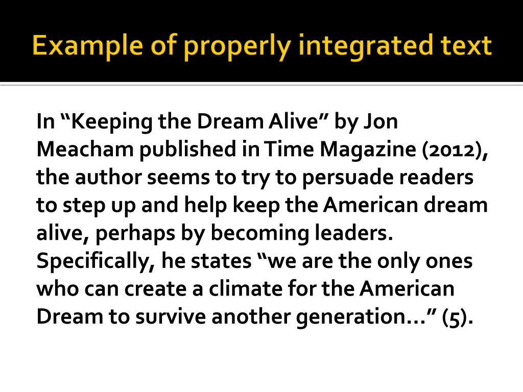 Example of properly integrated text In “Keeping the Dream Alive” by Jon Meacham published in Time Magazine (2012), the author seems to try to persuade readers to step up and help keep the American dream alive, perhaps by becoming leaders. Specifically, he states “we are the only ones who can create a climate for the American Dream to survive another generation…” (5).