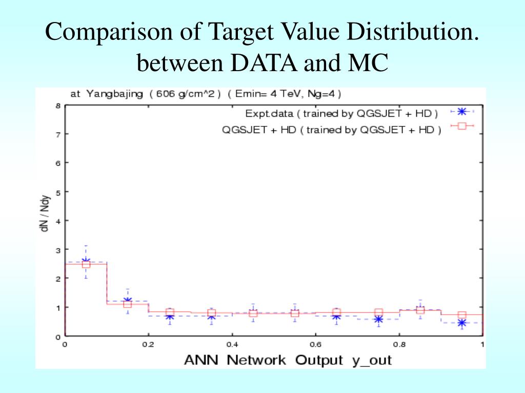 Parameters for training ( sumE, Ng, < R >, <ER>, sec(θ), Ne) Target value for protons=0 others=1 Define threshold value “Tth” Selection efficiency ofproton events as a function of “Tth” Selection of proton-induced events with ANN Purity~85% Efficiency~75% Tth=0.4 Target Value (T)