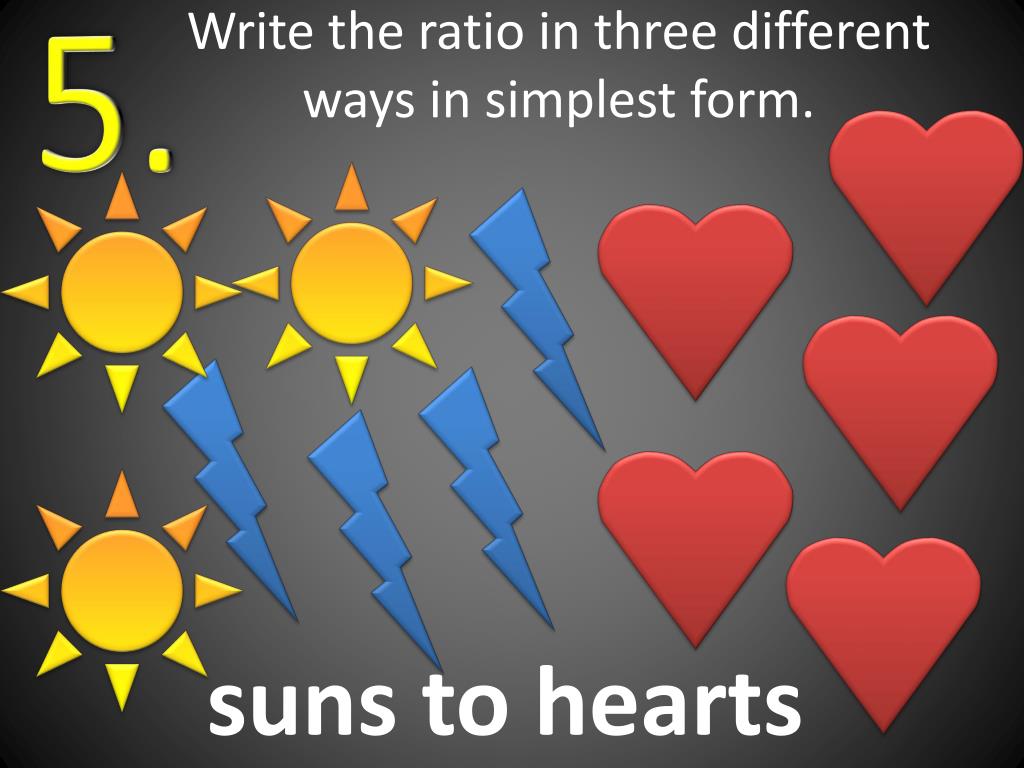 5. Write the ratio in three different ways in simplest form. suns to hearts