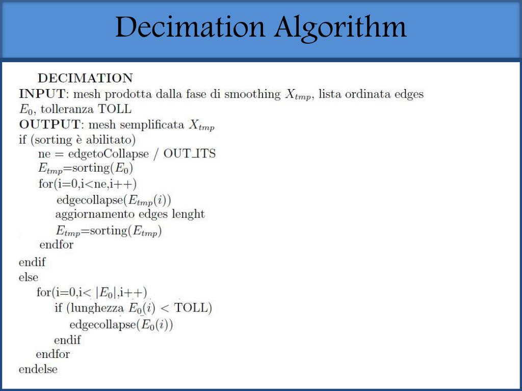 Decimation 2 possibili approcci selezionabili: • Sorting degli edge • Controllo lunghezza edge Applicazione dell’edgecollapse sull’edge scelto.