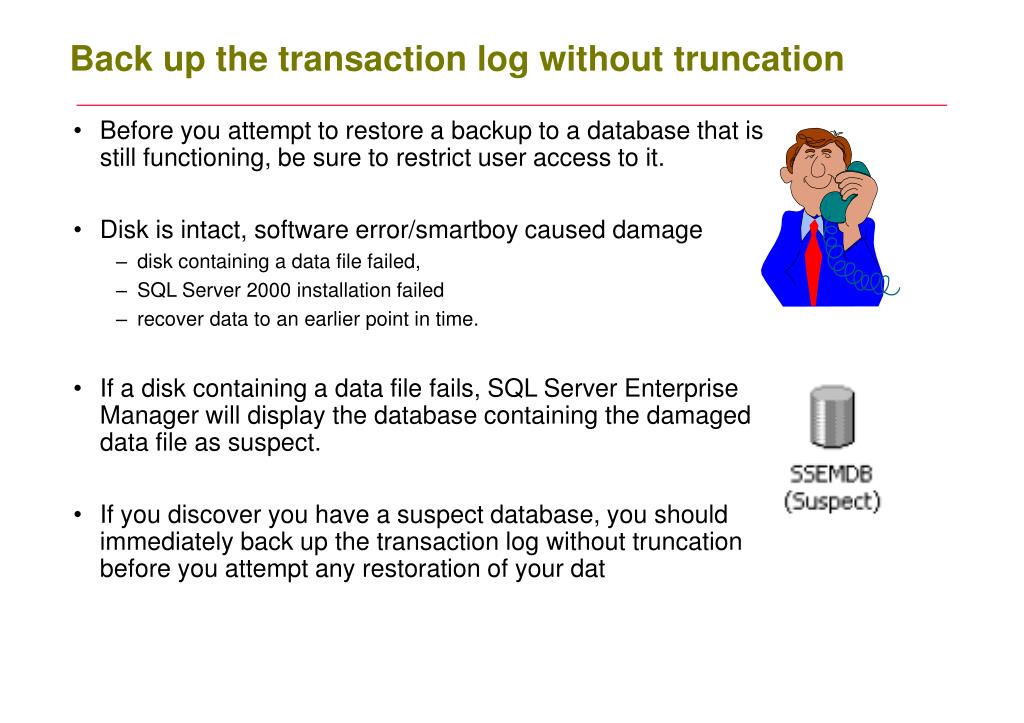 Back up the transaction log without truncation • Before you attempt to restore a backup to a database that is still functioning, be sure to restrict user access to it. • Disk is intact, software error/smartboy caused damage • disk containing a data file failed, • SQL Server 2000 installation failed • recover data to an earlier point in time. • If a disk containing a data file fails, SQL Server Enterprise Manager will display the database containing the damaged data file as suspect. • If you discover you have a suspect database, you should immediately back up the transaction log without truncation before you attempt any restoration of your dat