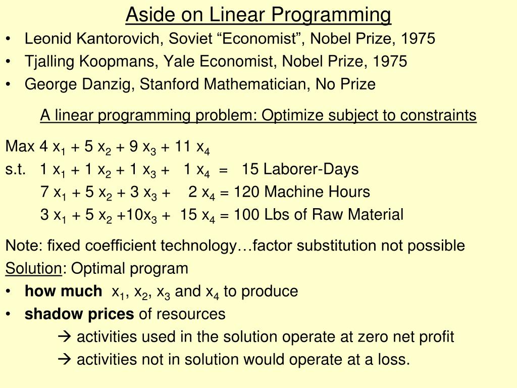 Aside on Linear Programming • Leonid Kantorovich, Soviet “Economist”, Nobel Prize, 1975 • Tjalling Koopmans, Yale Economist, Nobel Prize, 1975 • George Danzig, Stanford Mathematician, No Prize A linear programming problem: Optimize subject to constraints Max 4 x1 + 5 x2 + 9 x3 + 11 x4 s.t. 1 x1+ 1 x2 + 1 x3 + 1 x4 = 15 Laborer-Days 7 x1+ 5 x2 + 3 x3 + 2 x4= 120 Machine Hours 3 x1 + 5 x2+10x3+ 15 x4= 100 Lbs of Raw Material Note: fixed coefficient technology…factor substitution not possible Solution: Optimal program • how much x1, x2, x3 and x4 to produce • shadow prices of resources activities used in the solution operate at zero net profit activities not in solution would operate at a loss.