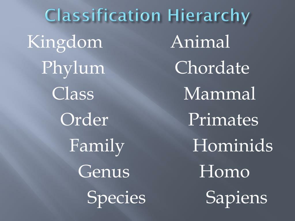 Kingdom Animal Phylum Chordate Class Mammal Order Primates Family Hominids Genus Homo Species Sapiens Classification Hierarchy