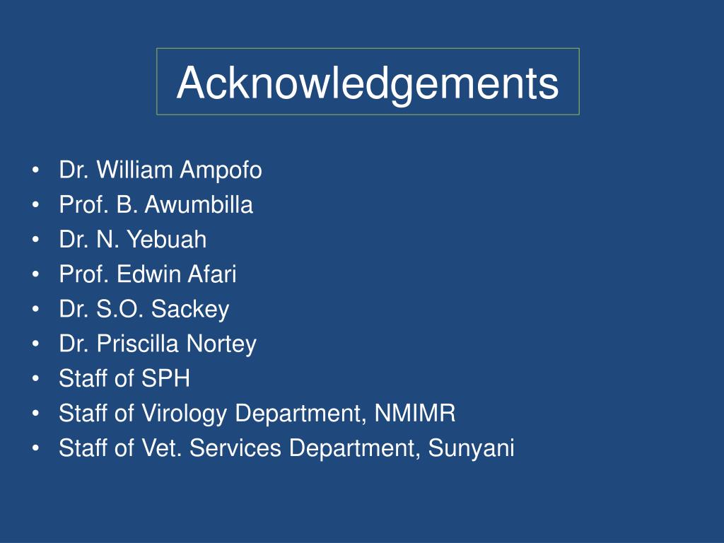 Acknowledgements • Dr. William Ampofo • Prof. B. Awumbilla • Dr. N. Yebuah • Prof. Edwin Afari • Dr. S.O. Sackey • Dr. Priscilla Nortey • Staff of SPH • Staff of Virology Department, NMIMR • Staff of Vet. Services Department, Sunyani