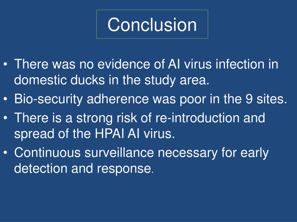 Conclusion • There was no evidence of AI virus infection in domestic ducks in the study area. • Bio-security adherence was poor in the 9 sites. • There is a strong risk of re-introduction and spread of the HPAI AI virus. • Continuous surveillance necessary for early detection and response.