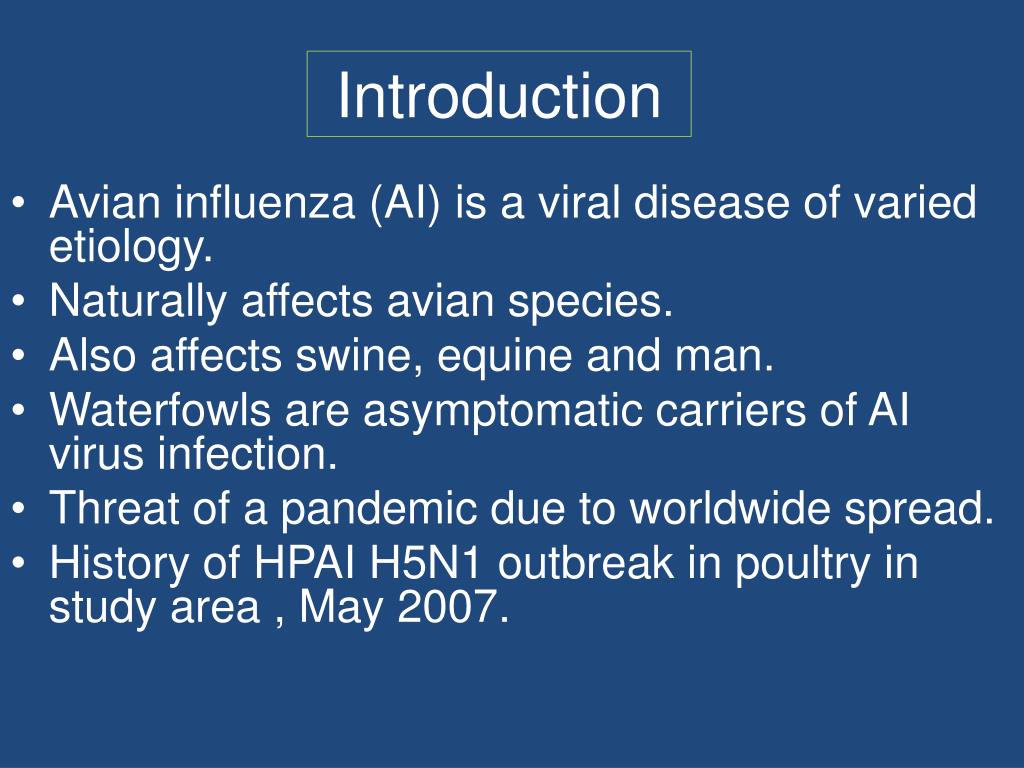 Introduction • Avian influenza (AI) is a viral disease of varied etiology. • Naturally affects avian species. • Also affects swine, equine and man. • Waterfowls are asymptomatic carriers of AI virus infection. • Threat of a pandemic due to worldwide spread. • History of HPAI H5N1 outbreak in poultry in study area , May 2007.