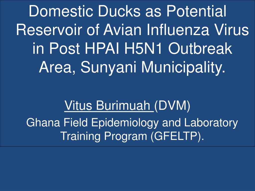 Domestic Ducks as Potential Reservoir of Avian Influenza Virus in Post HPAI H5N1 Outbreak Area, Sunyani Municipality. Vitus Burimuah (DVM) Ghana Field Epidemiology and Laboratory Training Program (GFELTP).