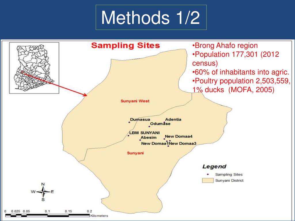 Methods 1/2 • Brong Ahafo region • Population177,301 (2012 census) • 60% of inhabitants into agric. • Poultry population 2,503,559, 1% ducks (MOFA, 2005)