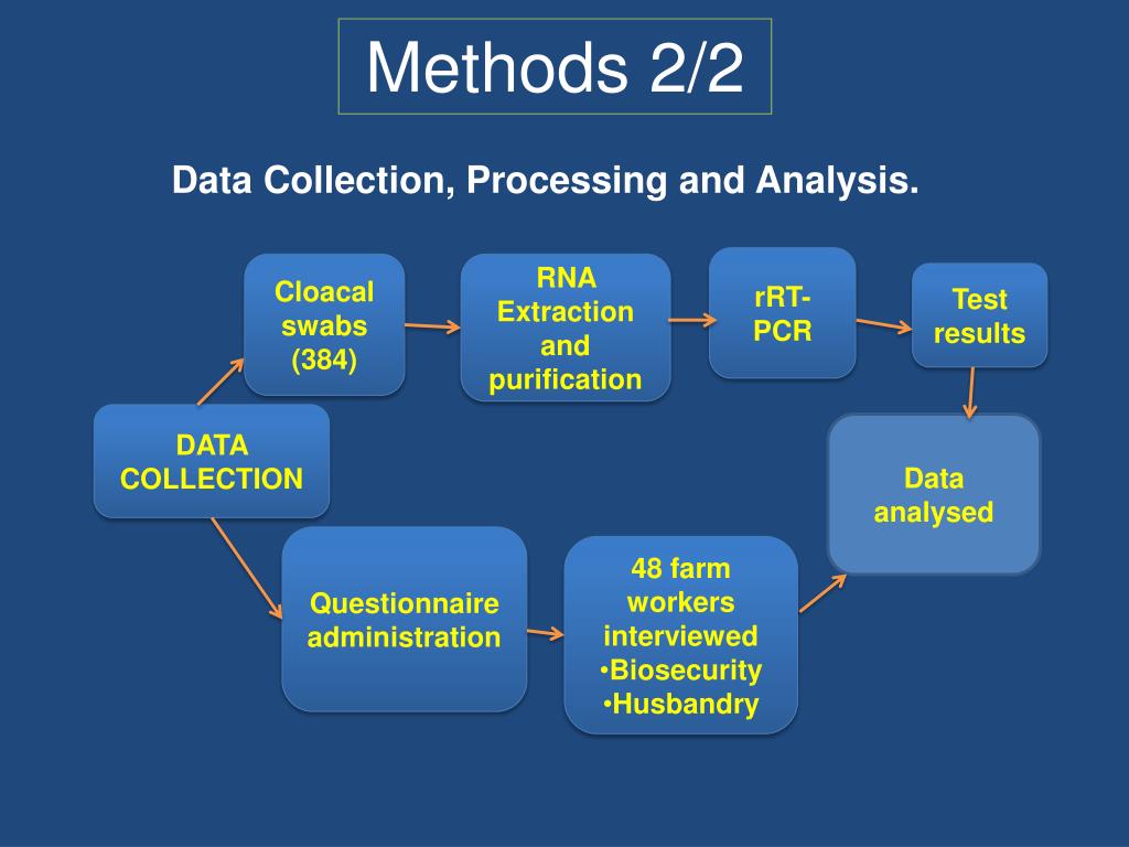 Methods 2/2 Data Collection, Processing and Analysis. rRT-PCR Cloacal swabs (384) RNA Extraction and purification Test results DATA COLLECTION Data analysed Questionnaire administration • 48 farm workers interviewed • Biosecurity • Husbandry