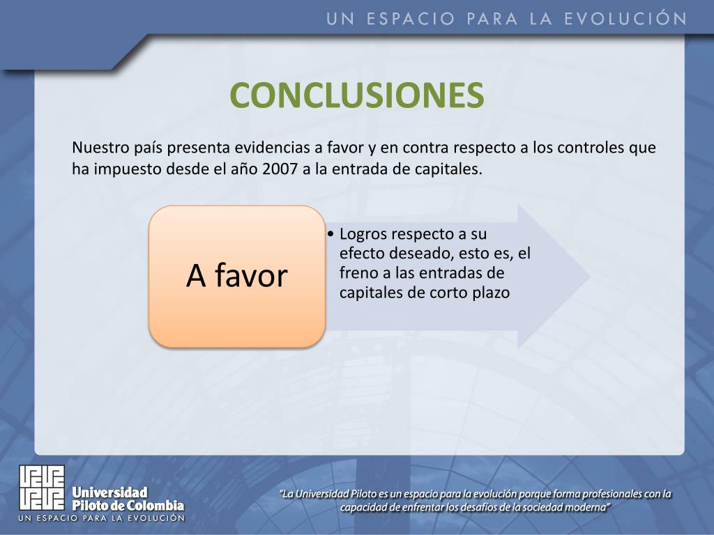 CONCLUSIONES Nuestro país presenta evidencias a favor y en contra respecto a los controles que ha impuesto desde el año 2007 a la entrada de capitales.