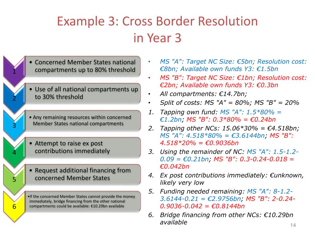 Example 3: Cross Border Resolution in Year 3 • MS "A": Target NC Size: €5bn; Resolution cost: €8bn; Available own funds Y3: €1.5bn • MS "B": Target NC Size: €1bn; Resolution cost: €2bn; Available own funds Y3: €0.3bn • All compartments: €14.7bn; • Split of costs: MS "A" = 80%; MS "B" = 20% • Tapping own fund: MS "A": 1.5*80% = €1.2bn; MS "B": 0.3*80% = €0.24bn • Tapping other NCs: 15.06*30% = €4.518bn; MS "A": 4.518*80% = €3.6144bn; MS "B": 4.518*20% = €0.9036bn • Using the remainder of NC: MS "A": 1.5-1.2-0.09 = €0.21bn; MS "B": 0.3-0.24-0.018 = €0.042bn • Ex post contributions immediately: €unknown, likely very low • Funding needed remaining: MS "A": 8-1.2-3.6144-0.21 = €2.9756bn; MS "B": 2-0.24-0.9036-0.042 = €0.8144bn • Bridge financing from other NCs: €10.29bn available