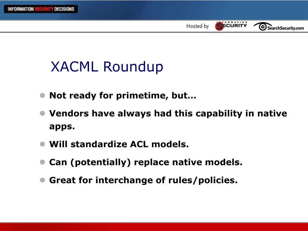 XACML Roundup • Not ready for primetime, but… • Vendors have always had this capability in native apps. • Will standardize ACL models. • Can (potentially) replace native models. • Great for interchange of rules/policies.
