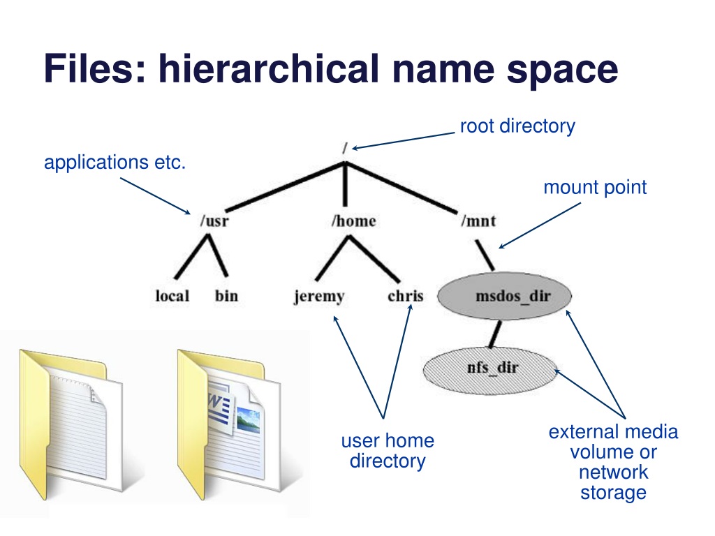 Files: hierarchical name space root directory applications etc. mount point external media volume or network storage user home directory